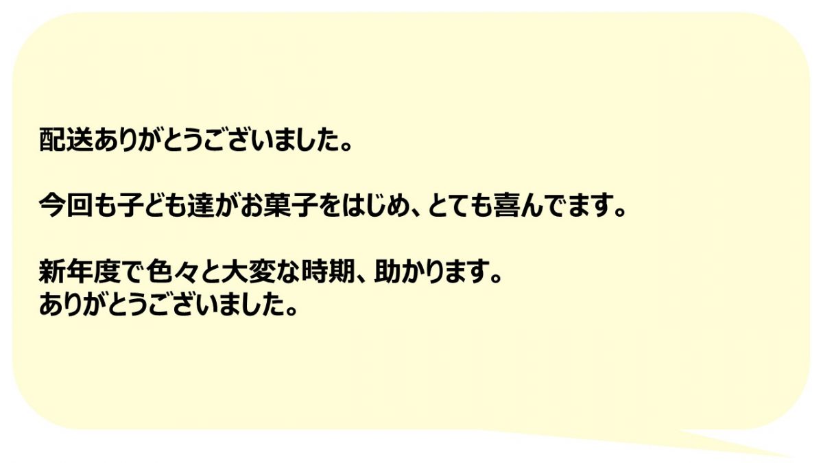 気温の変化も激しく体調を崩しやすい時期ですが、こども宅食でお届けした食品や日用品を活用していただき、元気に過ごしていただければと思います。
