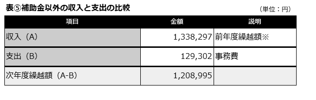 補助金以外の支出とは、文京区補助金(ふるさと納税等)以外から支出した経費のことです。具体的には、補助対象外事務費(スタッフ交通費、業務用パソコンの費用等)が含まれます。繰越金1,338,297円のうち、実際に発生した経費は129,302円であったため、差額の1,208,995円は次期に繰り越します。(表⑤)