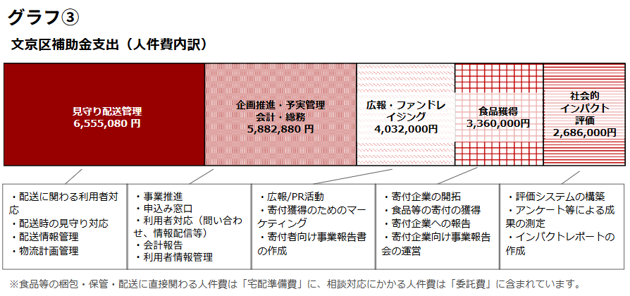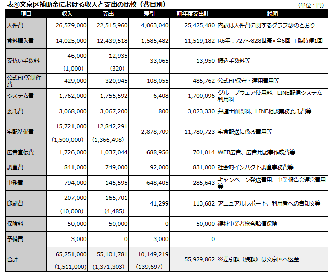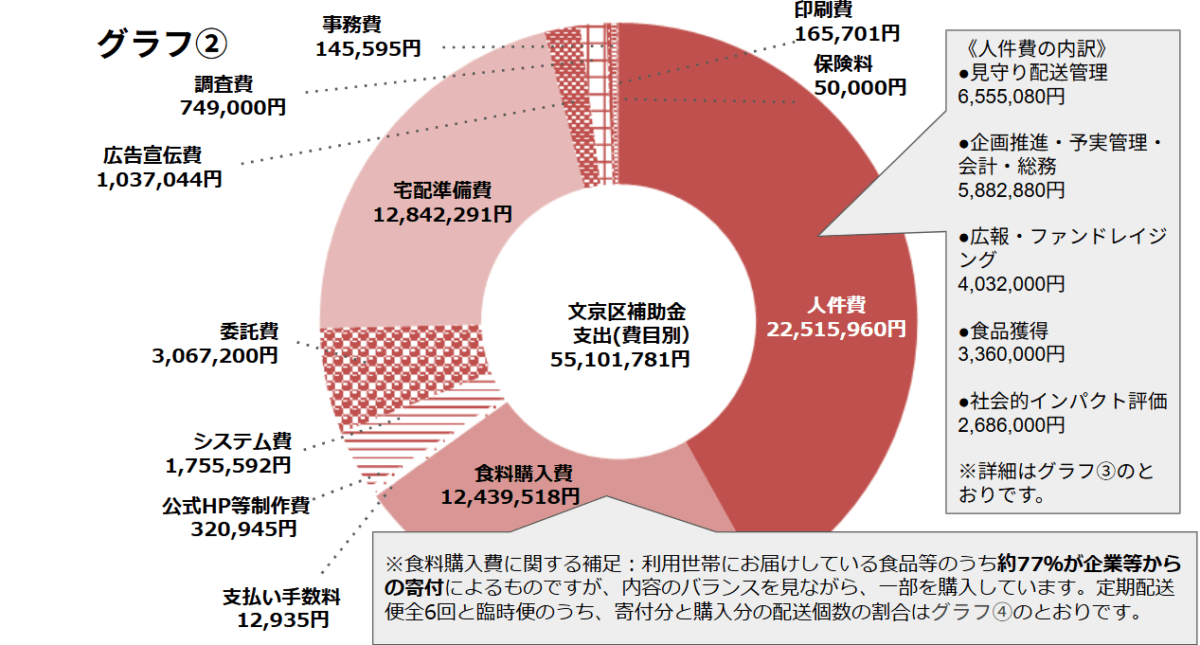 寄付金については、全額文京区の「子ども宅食プロジェクト基金」に積み立てた上で管理されています。2024年度は、区の基金から63,740,000円を取り崩し文京区より補助金として交付されました。
