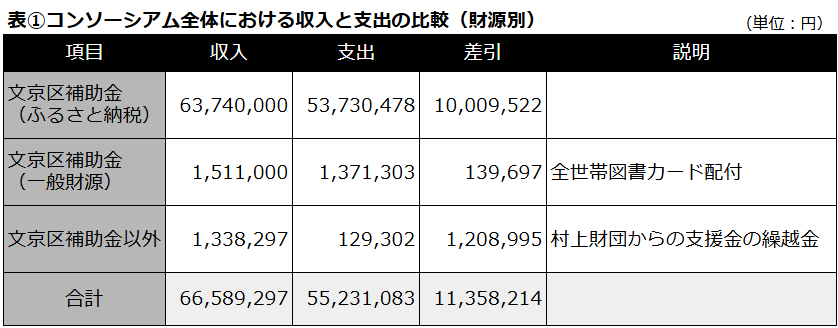 ●コンソーシアム総収入のうちの文京区補助金収入について報告します。文京区補助金収入(65,251,000円)の内訳は、ふるさと納税(63,740,000円)及び文京区一般財源(1,511,000円)を原資にしています。(表③)