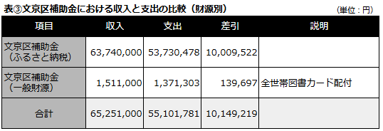 ●文京区補助金全体についての収入と支出の比較は表③のとおりです。