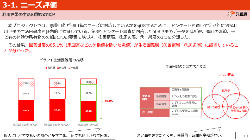 詳細として、全体に占める困窮層の割合は減少したものの、物価高騰の影響と見られる周辺層の割合が10%以上拡大しています。この周辺層の増加により、生活困難層全体の割合は前回(79.1%)から今回(85.1%)へと増加しており、世帯全体の困窮度は高まっていることがわかりました。利用世帯の厳しい生活状況と、継続的な支援の必要性を改めて示しています。