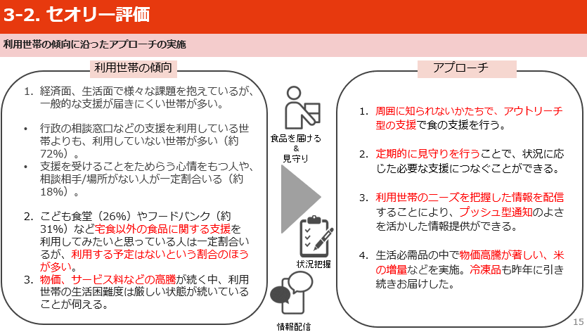 利用世帯は、経済面・生活面で様々な課題を抱えており、物理的・精神的な理由から、一般的な支援に自らアクセスできない層が一定数存在します。こうした状況において、「周囲に知られずに食品を届け、定期的な見守りや状況に応じた必要な支援につなげる」というアウトリーチ型※のアプローチは、改めて有効性が高いことが確認されました。
