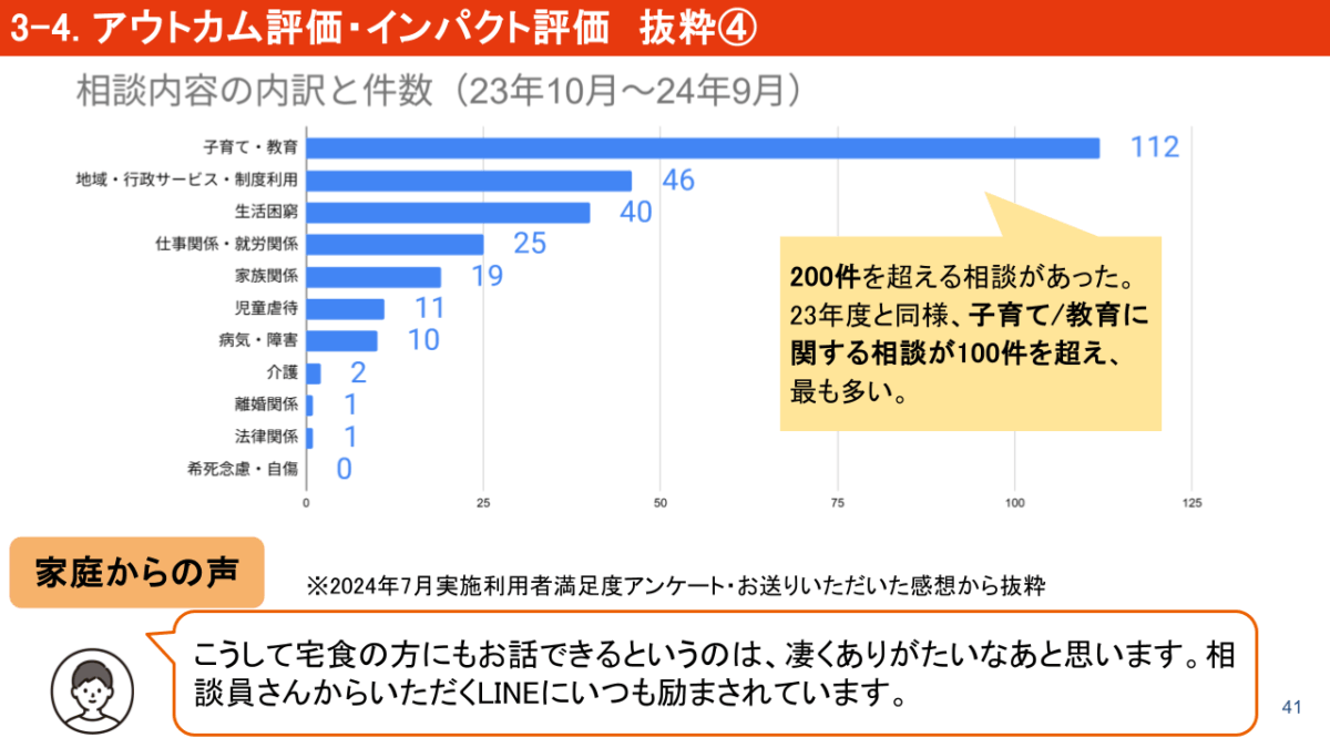 2023年10月から2024年9月までの延べ相談件数は200件を超え、利用者の半数以上(54.3%)が「また相談したい」と回答するなど、高い満足度とニーズが確認されています。相談内容は「子育て・教育」に関するものが半数を占めるほか、制度利用、生活困窮、仕事・就労関係など多岐にわたりました。多様な課題を抱える利用者のニーズに寄り添い、保護者が助けを求めることができる場となっていることが伺えます。