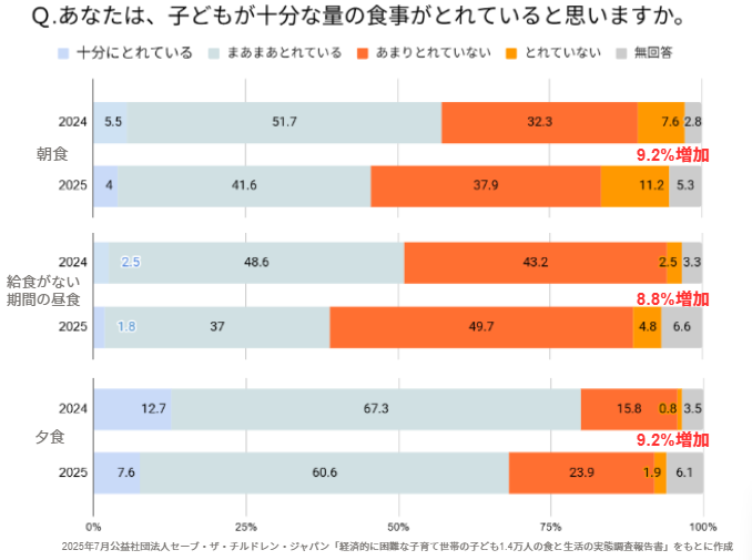また別の調査(※3)では、「朝食」「長期期間中など給食がない期間の昼食」「夕食」について子どもが十分な量の食事を取れていないという回答が、2024年度の調査と比較していずれも8%以上増加し、日常的な食生活が昨年より悪化している現状が懸念される結果となっています。